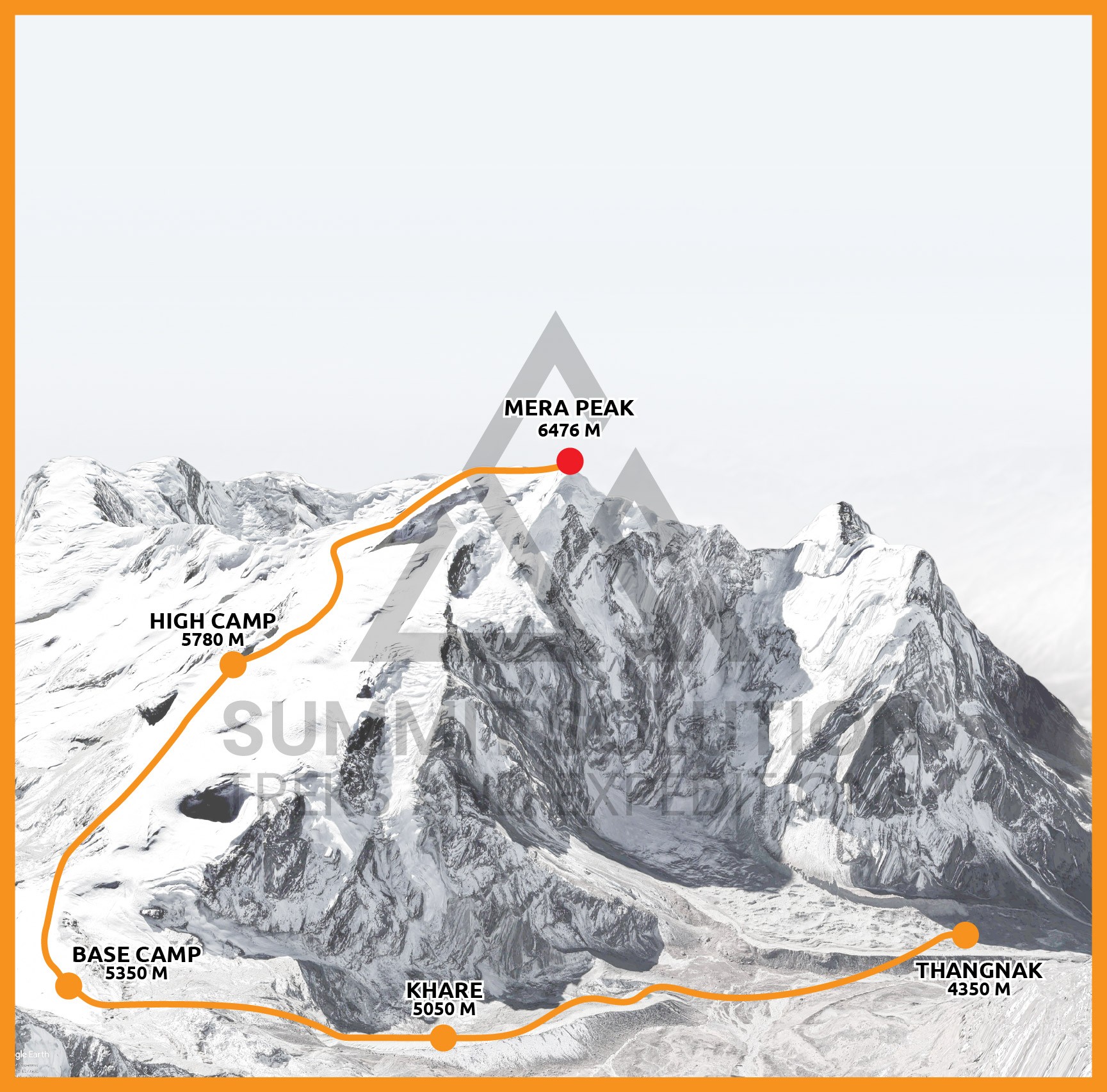 The expedition begins with a thrilling mountain flight to Lukla, followed by trekking through picturesque Sherpa villages, lush forests, and high Himalayan passes. The route crosses the Zatrwa La Pass at 4,610 meters, offering incredible views of rolling hills and distant peaks. Base Camp is situated at 5,300 meters on the Mera Glacier, providing climbers with the opportunity to practice essential mountaineering skills such as crampon use, ice axe techniques, and navigating fixed ropes under the guidance of our experienced Sherpa team.