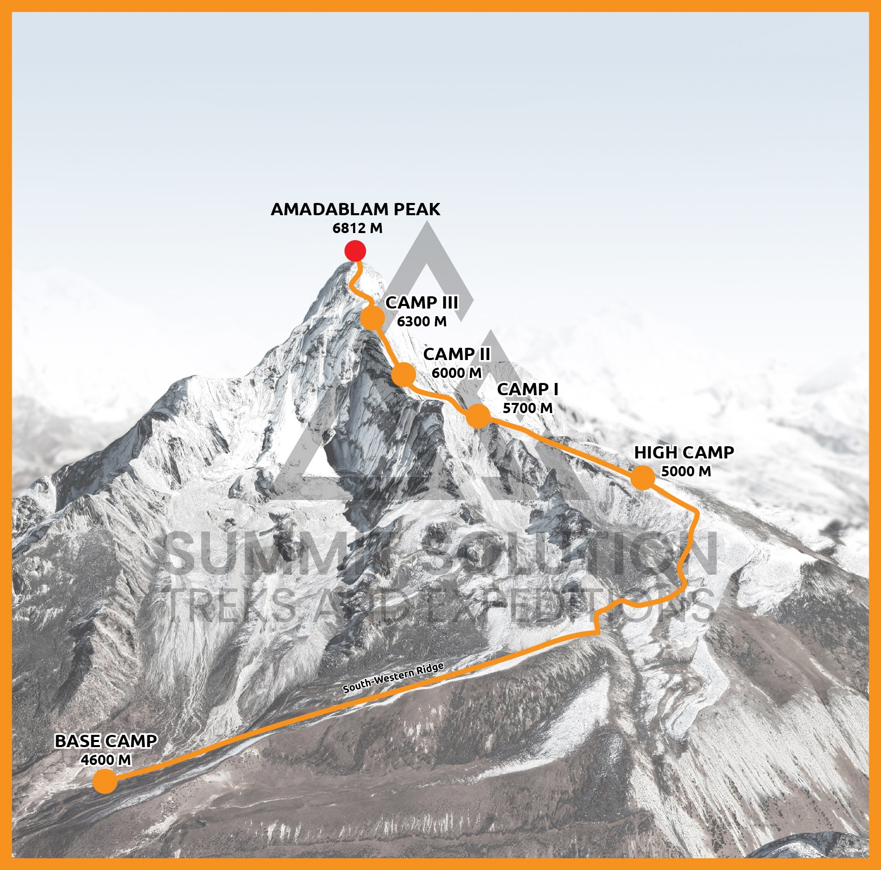 The Southwest Ridge, first ascended in 1961, is the classic route and remains the most popular line to the summit. Summit Solution Treks and Expedition follows a carefully planned itinerary with three high camps above Base Camp to optimize acclimatization and ensure climber safety: Base Camp (4,600m) serves as the main staging area, Camp I (5,800m) offers a safe resting point after moderate rock and snow climbing, Camp II (6,200m) includes exposed granite ridges and technical climbing sections, and Camp III (6,400m) is situated just below the hanging glacier “Dablam.” The final summit push demands determination, technical skill, and careful navigation, but the breathtaking Himalayan panorama from the top makes every effort worthwhile.
